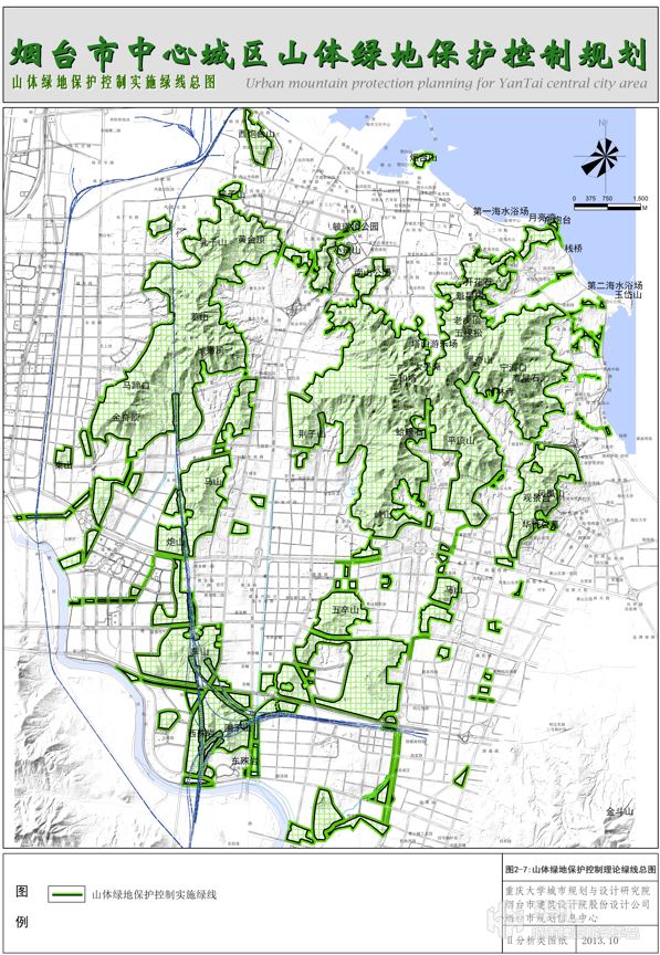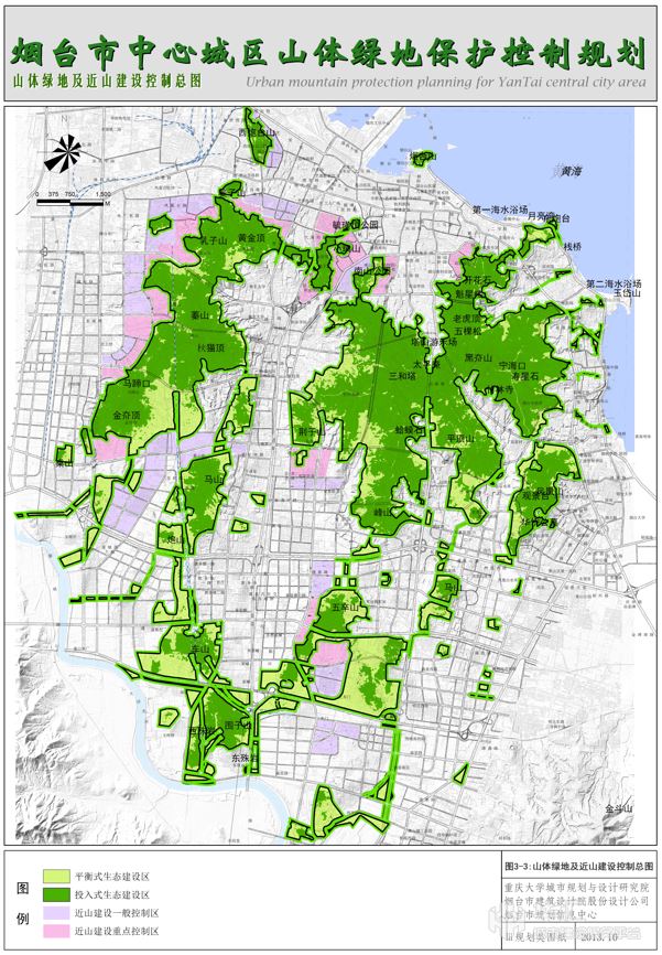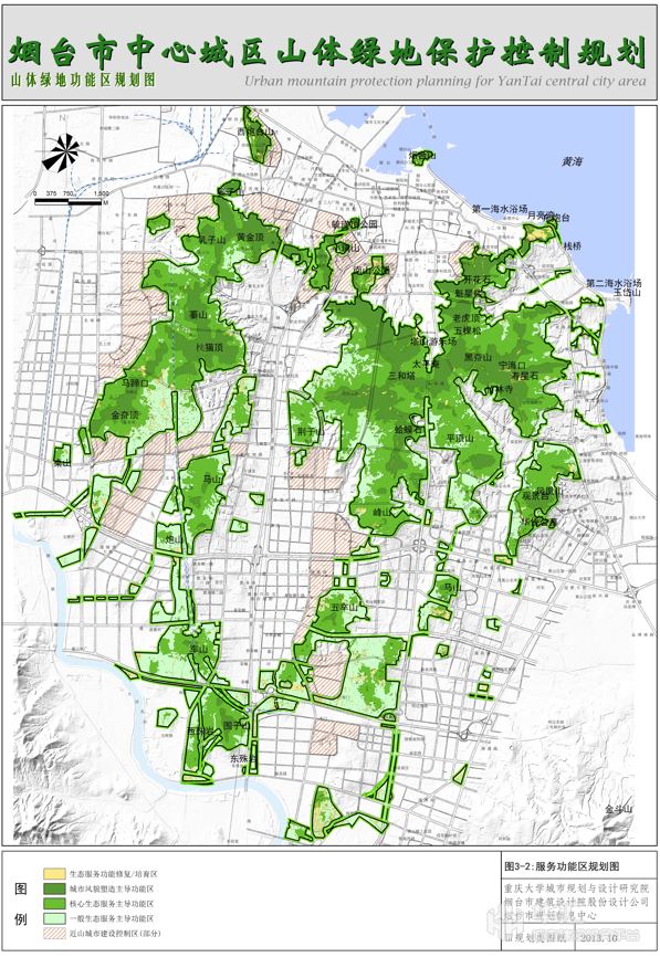 本項(xiàng)目以煙臺(tái)市中心城區(qū)蓁山、塔山、岱王山及周邊約60平方公里山體為規(guī)劃對(duì)象,兼顧約10平方公里的近山建設(shè)用地。綜合應(yīng)用地理信息系統(tǒng)(GIS)、衛(wèi)星遙感(RS)技術(shù),提出城市山體保護(hù)控制綠線的數(shù)量化識(shí)別方法,構(gòu)建山體綠線及近山建設(shè)用地管控的數(shù)量化指標(biāo)體系、制定系統(tǒng)化山地綠線管控圖則、設(shè)計(jì)山體綠線管理實(shí)施詳案。