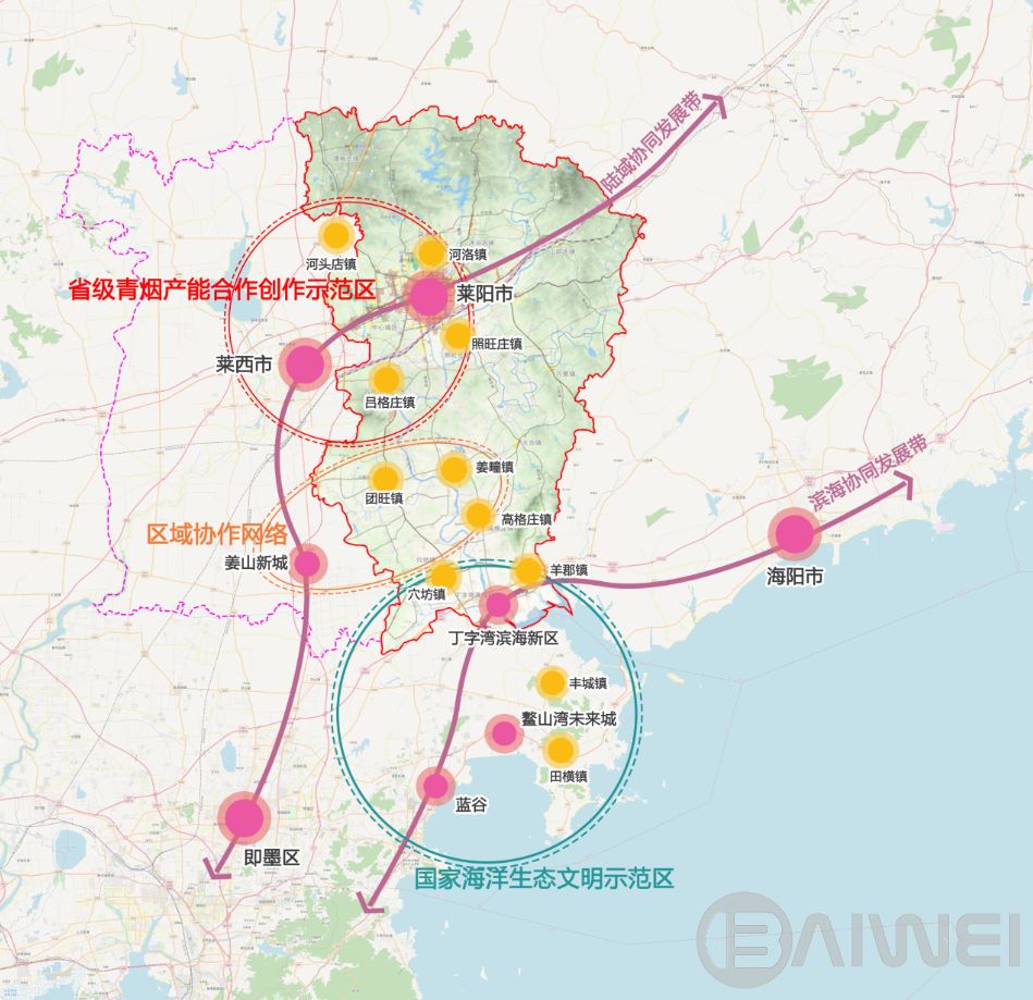 空間結(jié)構(gòu):積極推動“雙萊區(qū)域一體化發(fā)展”并加快構(gòu)建萊陽“一帶兩區(qū)、四大板塊”的市域城鎮(zhèn)空間結(jié)構(gòu)。